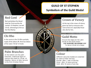 The Guild Medal is a reminder that you are serving Christ, made present at the Altar during Mass. Below is a diagram explaining the symbolism of the medal, as well as the awards given by the Guild of St Stephen for years of service.