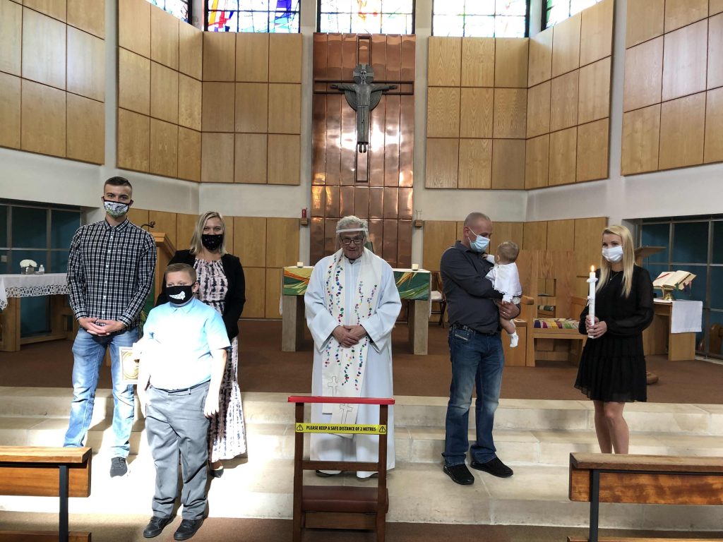 Below is a picture of Father Chris on his 25th Anniversary celebration, along with his first baptism wearing the Stole presented to him by our local school, which the children handmade for him.It contains all the children’s fingerprints at the school in paint which look like flowers going up the Stole.